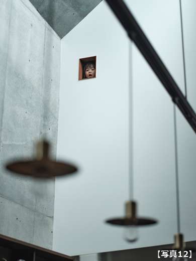 かと思うと、あえて上階に小さな小さな覗き窓だけをポツッと設けて、顔を出して住まいの景色を眺めたり、子供さんがいないいないばあをして楽しむような、吹き抜けならではの立体的な遊び心もまた魅力的ですね。