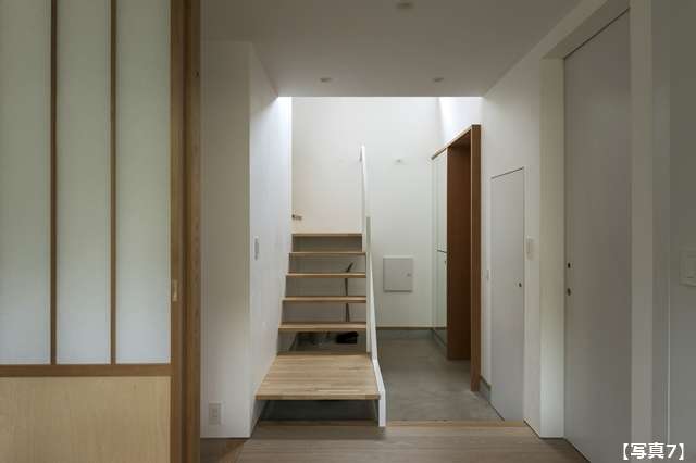下の2つの住まいでは玄関を吹き抜けにして、2階のレベルに大きな窓を設けています。1階に窓はなく、光は頭上からだけ降ってきます。こうすることで、住まいに入った直後に意識が自然と2階に導かれて行くのです。