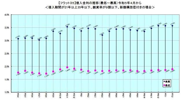 返済期間21年以上35年以下の最低金利は、融資率9割以下が1.89%、9割超が2.00%と、いずれも前月から0.03ポイント上がり、2カ月ぶりに上昇した。最高金利は、9割以下が3.57%、9割超が3.68%と横ばい。