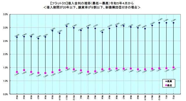 返済期間20年以下の「フラット20」の最低金利は、融資率9割以下が1.50%、9割超が1.61%で、前月から0.03ポイント上がり、2カ月ぶりに上昇。最高金利は、9割以下が3.18%、9割超が3.29%だった。
