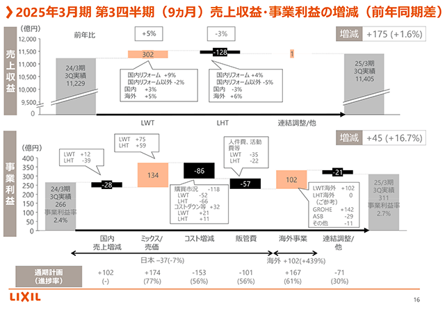 LIXIL(東京都品川区)が1月31日公表した2025年3月期第3四半期(2024年4~12月)の連結決算は、売上収益は前年同期比1.6%増の1兆1404億5600万円、営業利益は同11.6%増の284億600万円、経常利益は同11%増の212億7600万円となった。純利益は黒字だが、金融・税金費用が増えたことで同36.8%減の42億8300万円で着地した。