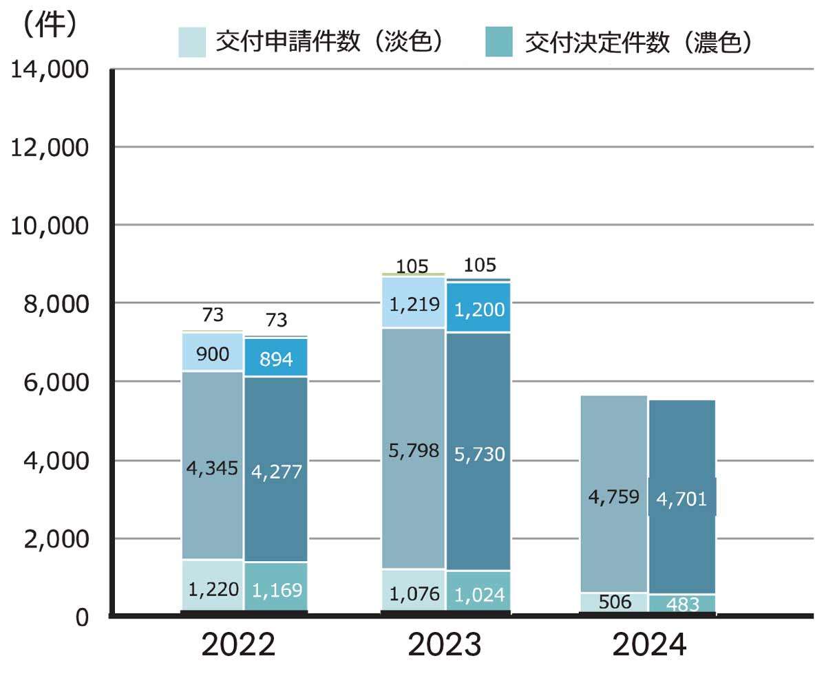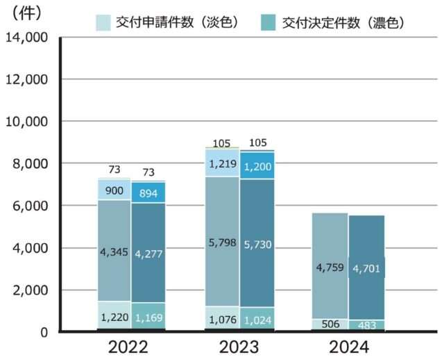 24年度の戸建ZEH支援事業で補助金の交付決定を受けたのはZEH483戸、ZEH+4701戸の計5184戸[グラフ1]。ZEH+が交付決定件数の9割を超え、かつ24年度から導入された「ハイグレード仕様」(断熱等級6以上の外皮性能および一次エネルギー消費量30%以上削減)が3005戸と、全体の58.0%、ZEH+の6割以上を占めるに至っている。