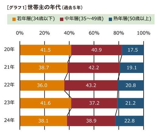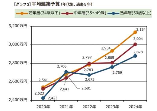 一方、熟年層は22.8%で前年比1.6ポイントの増加となった。平均予算が最も高いのは若年層の3134万円で、前年比 200万円のプラスだ[グラフ2]。中年層も2805万円から3004万円にアップした。熟年層も119万円アップの2878万円で、全ての年代で過去最高額を更新している。