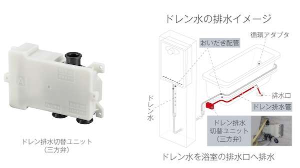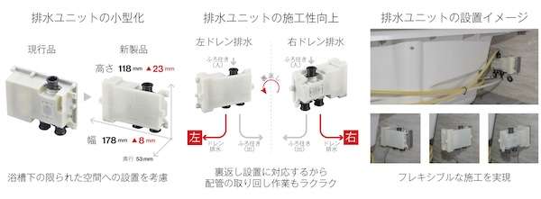 今回のモデルチェンジでは、この専用部材「ドレン排水切替ユニット(三方弁)」を20%小型化。作業しづらい浴槽エプロン内でのユニットの施工性を向上した。