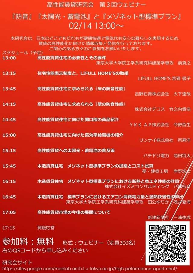 研究会メンバーの前真之・東京大学大学院准教授による講演「高性能賃貸の必要性とその要件」のほか、吉野石膏、デコス、YKK AP、リンナイなどが高性能賃貸住宅における防音性能や、開口部・高効率給湯器の紹介を行う。また、ハチドリ電力が高性能賃貸への太陽光・蓄電池の普及策について発表する。