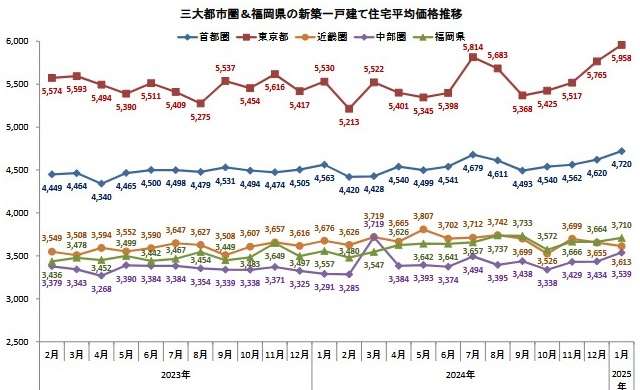 福岡県は3710万円(1.3%増)と上昇に転じたが、前年9月の水準には届かなかった。福岡市は4610万円(6.9%増)と上昇が続いている。