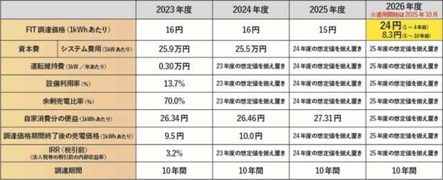 住宅用(10kW未満)の場合、既に決定している25年度の買取単価は15円/kWh。対して26年度は、当初4年間の単価を24円/kWhに設定し、5~10年目は8.3円/kWhとする[表]。なお実際には、スキームの適用を狙った導入拡大の滞りを防ぎつつ、既に公表されている25年度の価格を前提としている事業者がいる可能性も踏まえ、今年10月からの適用となる。