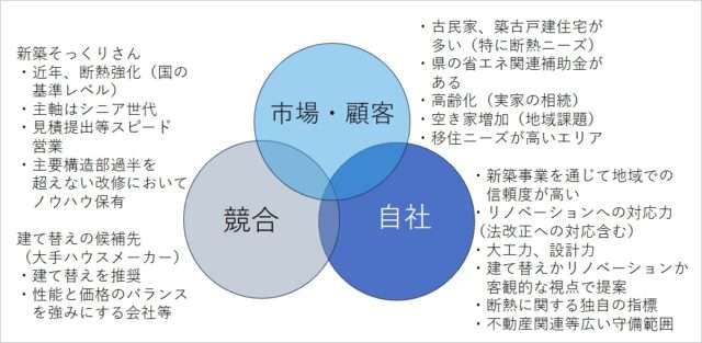 3つめの自社の視点としては、自社の基本理念や新築事業で培った強みの適合、人的資源は活かせるのか、空間デザインが得意なのか、それとも性能向上が得意なのか、4号特例縮小への対応力があるのかないのか、要員不足なら新築事業からのサポートや配置転換でリノベーション事業を補うことができるのか、といった資源の移転や比重の調整など今あるリソースを活かすこと、市場・顧客、競合の変化に合わせて補完すること、両面から柔軟性をもって検討しましょう。