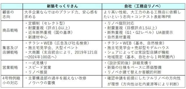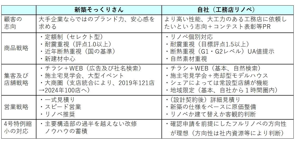 今年はストック市場を見据えた新築事業との統合や、4号特例縮小に向けて、主要構造部の過半を越えないプランの開発(以前から木造3階建向け改修で構造安全性を含めノウハウ蓄積)といった動向も、競合情報の一つとして押さえておくことは有用だと考えています。