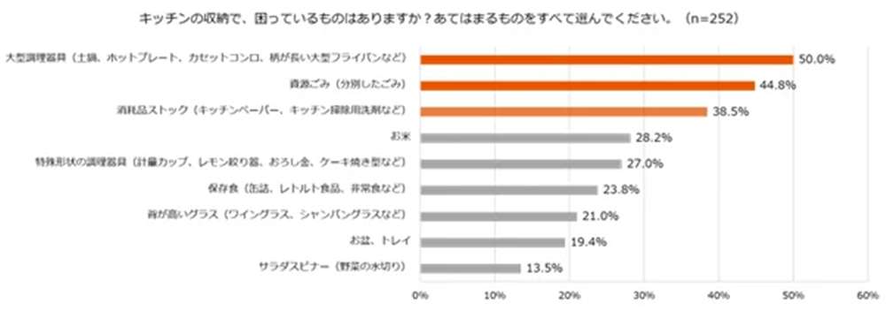 収納に困っているものを聞いたところ、最も多かったのは「大型調理器具(土鍋、ホットプレート、カセットコンロ、柄が長い大型フライパンなど)」(50.0%)だった。あると便利ではあるものの、大きさや形状、重さなどから、きれいに収納することが難しいケースが多いとみられる。「資源ごみ」は44.8%、「消耗品ストック(キッチンペーパー、キッチン掃除用洗剤など)」は38.5%だった。