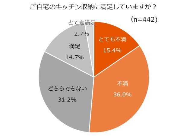 LIXIL(東京都品川区)は2月17日、同社サイトに来訪した20~80代以上の男女486人を対象に実施した「キッチン収納に関する意識調査」の結果を発表した。自宅のキッチン収納に満足しているか聞いたところ、「とても不満」が15.4%、「不満」が36.0%と、あわせて半数以上(51.4%)が不満を感じていることがわかった。