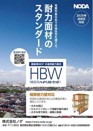 ノダ(東京都台東区)は、木造用耐力面材のスタンダードとして、全国の工務店に構造用MDF「HBW(ハイベストウッド)」を提案する。24時間水中に浸しても釘接合強度は低下しないことを実証済みの構造用面材。