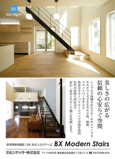 文化シヤッター(東京都文京区)は、オープンリビングに対応した住宅用室内階段「BX Modern Stairs(モダンステアーズ)」を販売する。シンプルで洗練されたスチールのシャープなデザインが空間に美しく調和する高い意匠性と、屋外鉄骨階段廊下ユニット「段十廊Ⅱ」で培った安心・安全設計を両立。また、受注から施工までの一貫した責任体制により、最短4週間の短納期を実現した。