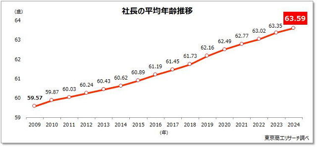 東京商工リサーチ(東京都千代田区)は2月17日、2024年「全国社長の年齢」調査の結果を公表した。社長の平均年齢は63.59歳と前年を0.24歳上回り、調査を開始した2009年以降、過去最高を更新した。
