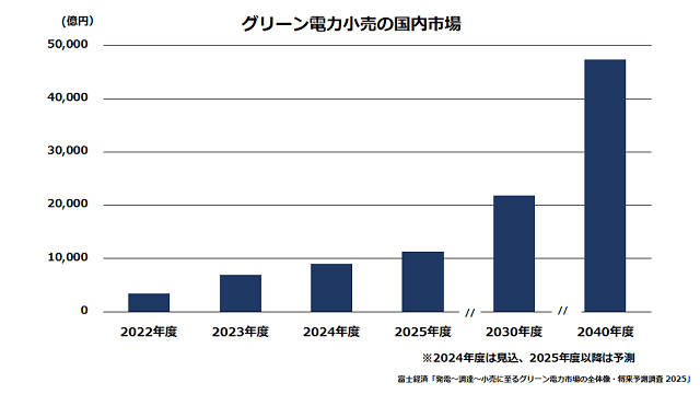 現状のグリーン電力小売市場は、製造業などの大企業や地方自治体、官公庁など大規模需要家向けの特別高圧電力が5割以上を占めており、2024年度は9032億円を見込む。今後は、RE100加盟企業などが2030年度もしくは2035年度をグリーン電力導入の中間目標にしているほか、多数のSBTi参加企業が2030年をSCOPE1+2におけるGHG排出量削減目標に設定、また2050年にCO2排出量実質ゼロを表明する自治体も増えていることから、高圧/特別高圧電力を中心に需要が拡大。2040年度の市場規模は、2023年度比6.9倍の4兆7359億円と予測した。