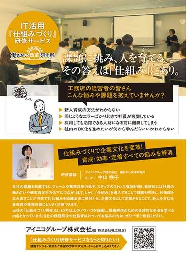 アイニコグループ(奈良県奈良市)は、課題に挑み、人を育てるためには、「仕組みづくり」がその答えになるとして、全国の工務店にITを活用した「仕組みづくり」研修サービスを行っている。研修では、同社の10年以上前から蓄積、凝縮されたノウハウを学び、これらの課題解決のための具体的な手法を身につけることができる。