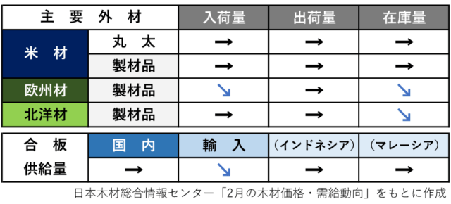 (一財)日本木材総合情報センター (JAWIC)が2月20日公表した「2月の木材価格・需給動向」(PDF)によると、米国材は丸太・製材品とも入出荷量・在庫量が横ばいに推移。欧州材は製材品の入荷量・在庫量が減少している。北洋材は製材品が減少。合板供給量は、国内製造量は横ばいに推移したが、輸入量が減少した。