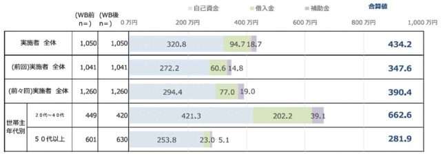 リフォーム検討者層の希望予算は平均277万円。実施者が検討した際の予算は平均291万円で、いずれも前年度から上昇している。また実際の費用では、50代以上が平均282万円に対し、初回リフォームの多い20~40代が平均663万円と高額になった。