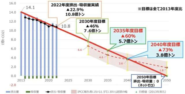 政府は2月18日、新たな地球温暖化対策計画を閣議決定した。2050年のCO2排出量実質ゼロに向け、2035年度に13年度比で60%、40年度には73%削減する目標を新たに設定[図]。パリ協定に基づくNDCとして、国連気候変動枠組条約事務局に提出した。家庭部門は40年度にCO2排出量71~81%削減を目標に[表]、住宅を含めた脱炭素型の暮らしへの転換、高断熱窓・高効率給湯器の導入支援といった施策を盛り込む。