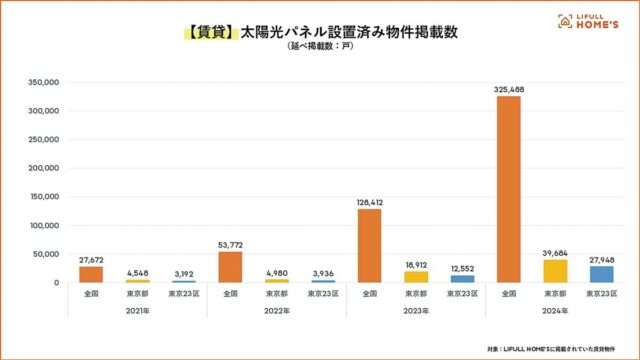 LIFULLが運営する不動産ポータルサイト・LIFULL HOME’Sは、今年4月から東京都が太陽光発電の設置を義務化するのに先駆け、同サイト掲載物件の太陽光パネル設置状況や賃料、価格について調査した。賃貸物件や戸建て住宅では、全国的に太陽光パネルを搭載した物件が増加しており、東京都でもほぼ同様の傾向になった。一方でマンションは2021年以降、全国的に減少傾向が見られる。
