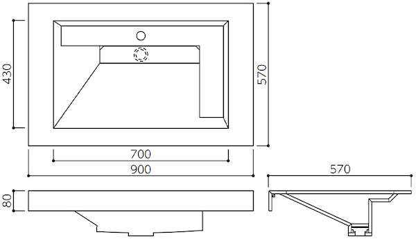 W900×D570×前だれH80mm、ボウル深さ180mm。26色。