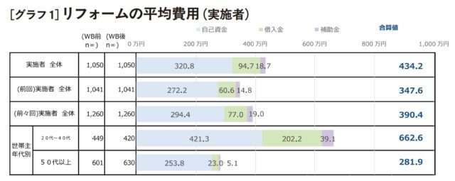 リフォーム検討者層の希望予算は平均277万円。実施者が検討した際の予算は平均291万円で、いずれも前年度から上昇している。また実際の費用では、50代以上が平均282万円に対し、初回リフォームの多い20~40代が平均663万円と高額になった。