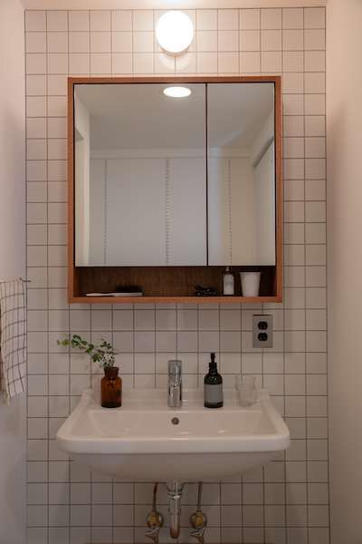 額縁のようにミラーを囲ったデザインとし、ミラーの高さをキャビネットよりも少し短いクロップド丈とすることで、必要なアイテムや小物を置けるスペースを確保した。