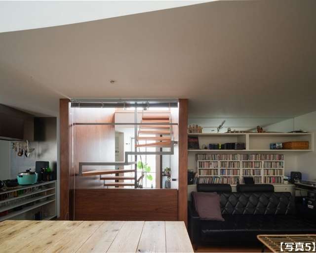 下の住まいでは光井戸の存在感をさらに強調しています。住まいの奥にあって本来なら真っ暗になるはずの場所に階段を設け、上階から思い切り自然光を浴びせて下階を照らしています。