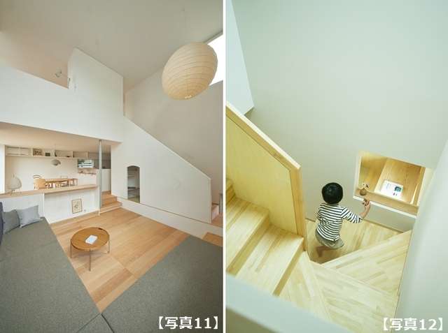 それを活用したのが下の写真左側の住まいです。広々とした吹き抜けの居間の一角に階段がありますが、そこには小さな入り口が設けられて、子供さんのひそみの場になっています。居間が広々して天井が高いだけに、この対比的な小ささは「ひそむ」魅力をますます強めてくれています。私だってここでひそんでみたいです。