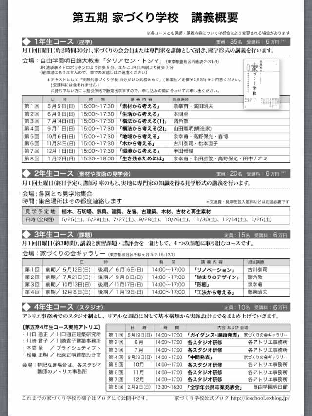 受講料は各コース6万円。複数コースを同時受講も可能。テキストとして、同学校講師らで執筆した「実践的家づくり学校 自分だけの武器を持て」(彰国社)を使う。詳しい問い合わせは同会(tel:03-5361-8061)まで。