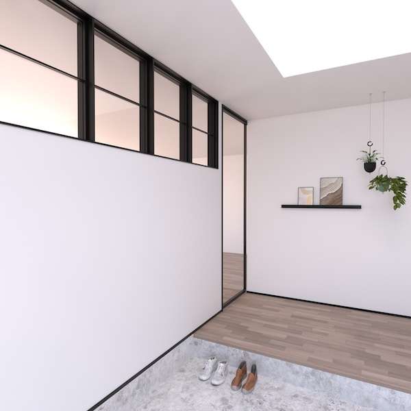 幅11mmのスリムな縦フレームとクリアガラスによる洗練されたデザインで彩光と間仕切りを両立。