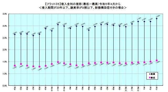 返済期間20年以下の「フラット20」の最低金利は、融資率9割以下が1.55%、9割超が1.66%で、前月から0.05ポイント上がり、2カ月連続上昇。最高金利は、9割以下が3.30%、9割超が3.41%と、いずれも0.12ポイント上昇した。