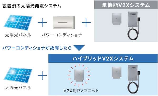 すでに太陽光発電システムを設置している住宅にも後付け可能で、既設の太陽光発電システムをそのまま使う場合は、従来と同様に単機能V2Xシステムとして併設することができる。その後、太陽光発電のパワーコンディショナが故障した場合は、その時点でV2X用PVユニットに置き換えることで、ハイブリッドV2Xシステムへと移行することができる。