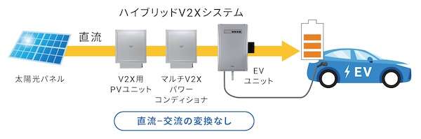 新規に太陽光発電システムと電気自動車を導入する場合は、ハイブリッドV2Xシステムを選ぶことで、発電した直流電気をそのままEVに充電するため、単機能システムで発生していた電力の変換ロスが解消される。