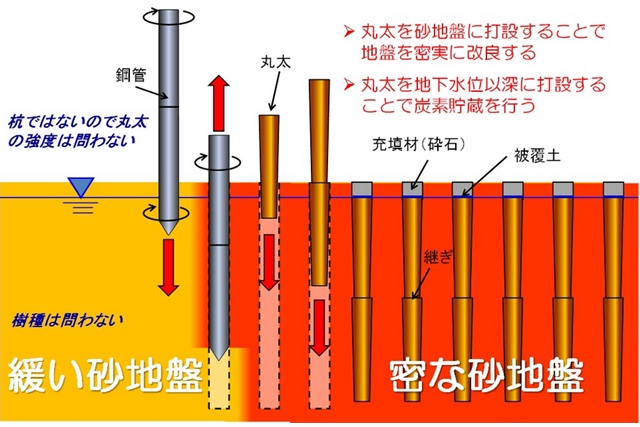 支持層に傾斜がある場合は、浅い場所と深い場所でテノキューブ工法とテノコラム工法を組み合わせることも可能とする。