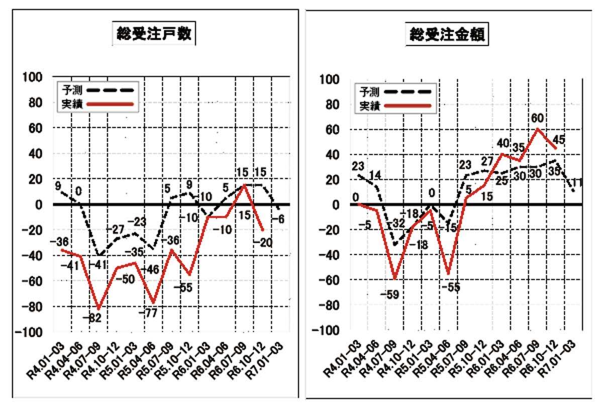 第4四半期(25年1~3月)の見通しは受注戸数でマイナス6ポイント、受注金額ではプラス11ポイントとなった。