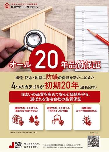 ジャパンホームシールド(JHS、東京都墨田区)はこのほど、構造・防水・地盤の20年保証に加え、防蟻でも20年間の保証を提供する「オール20年品質保証」を開始した。防蟻の保証金額は最大1000万円。さらに、それぞれの保証を併用するワンストップ対応を可能にし、雨漏りとシロアリ被害の併発など、複合的な不具合にも備える。