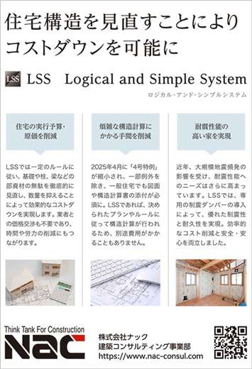 工務店支援のナック 建築コンサルティングカンパニー(東京都新宿区)は、構造を見直すことで住宅のコストダウンを実現するシステム「Logical and Simple System(LSS、ロジカル・アンド・シンプルシステム)」を全国の工務店に向けて提供している。