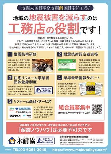 全国約1000社の工務店・リフォーム会社・設計事務所などから構成し、国土交通省の「住宅リフォーム事業者団体登録制度」の登録団体でもある日本木造住宅耐震補強事業者協同組合(木耐協、東京都千代田区)は、地震大国日本を地震”耐”国日本にするという使命感のもと、「地域の地震被害を減らすのは工務店の役割」と訴える。「耐震」は工務店の差別化メニューになるとして、耐震リフォーム事業を全面的に支援している。