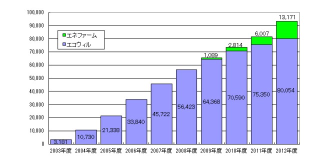 大阪ガス(大阪府大阪市)は、供給エリアの「エコウィル」と「エネファーム」を合わせた家庭用ガスコージェネレーションシステムの累計販売台数が今年1月末で9万台を超え、「エコウィル」または「エネファーム」と太陽光発電を組み合わせた「ダブル発電」の累計販売台数も今年2月末で1万件を突破したと発表した。2012年度の「ダブル発電」は、前年度の約2倍の販売件数という。