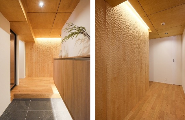 同物件では、床や天井、造作家具などに木をふんだんに使用。玄関の正面には、なぐり加工の木板が壁天井に貼られ、光によって凹凸の陰影が浮き上がる迫力ある空間とした。木の素材をバランスよく配置し、調和した内装に仕上げた。