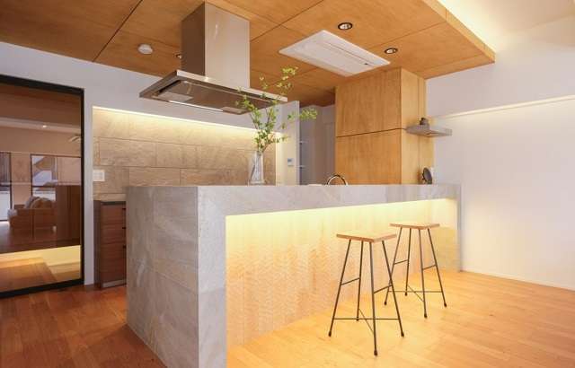 また、木材と相性の良い素材を各所に選定。造作キッチンに石材タイルを使い、腰板のなぐり加工の木材と合わせてキッチンカウンターをダイニングバーとして活用できるようにしたほか、寝室の小上がりスペースには畳を敷き、仕事や読書などに使えるようにした。