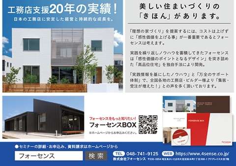 経験やデータに裏付けられたノウハウと実践情報が強みのフォーセンス(さいたま市)は、理想の家づくりを提案するには、「コストは上げずに感性価値を上げること」が一番重要とし、実践を繰り返し蓄積してきたノウハウで地域工務店をサポートする。