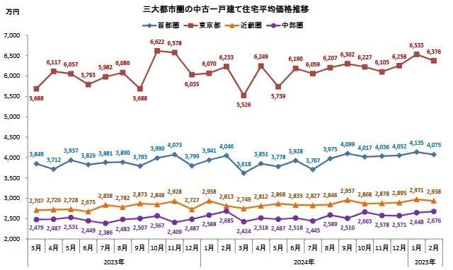東京都は6376万円(2.4%減)と反転下落。神奈川県は4412万円(2.6%減)と7カ月ぶりの下落となった。千葉県は2906万円(0.6%増)と連続上昇、埼玉県は2883万円(0.3%減)と反転下落した。前月は全都県が上昇したが、2月は千葉県を除き下落となった。築年数は軒並み若返ったが、東京都・神奈川県は平均土地・建物面積が縮小した。
