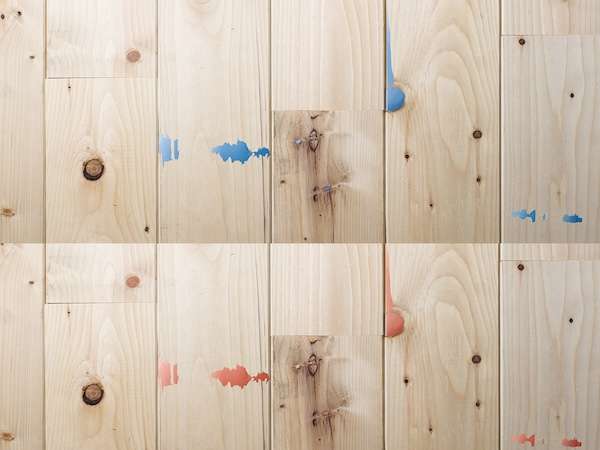 陶器の欠け・割れを修復する「金継ぎ」から着想し、木材の穴や割れを目立たなくするのではなく、あえて色を入れることで補修跡をデザインのアクセントとして利用。