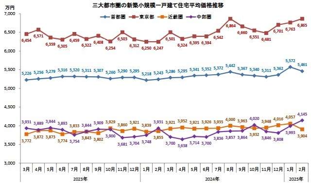 東京カンテイ(東京都品川区)は3月10日、主要都市における2月の新築小規模一戸建て(土地面積50㎡以上100㎡未満)の供給動向を発表した。首都圏・近畿圏は反転下落、中部圏は連続上昇した。