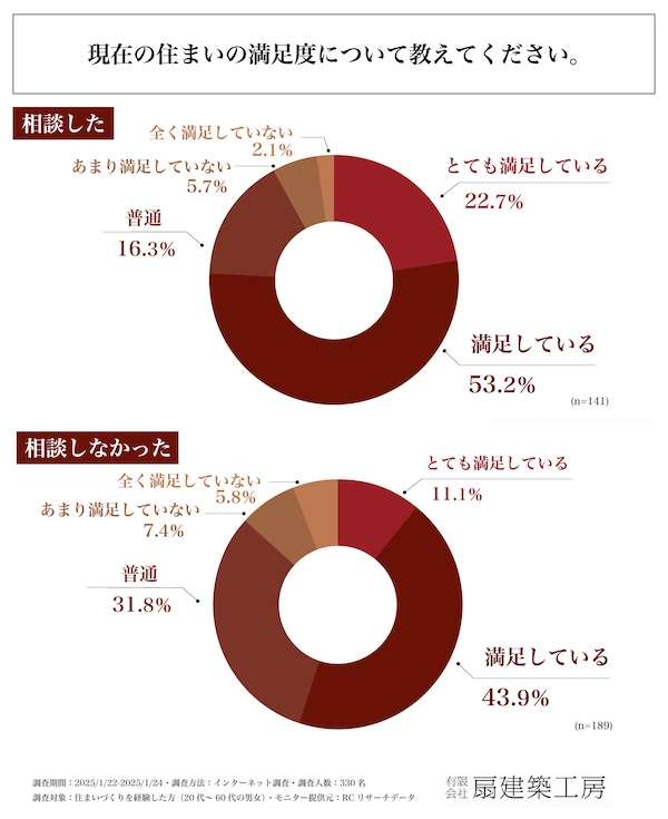 家づくりに際して、設計から施工まで一貫して対応できる建築士に相談した人の割合は42.7%で、その75.9%が現在の住まいに満足していると回答した。
