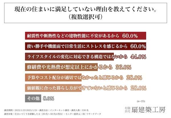 現在の住まいに満足していない人にその理由を聞くと(複数選択可)、「耐震性や断熱性などの建物性能に不安があるから」と「使い勝手や機能面で日常生活にストレスを感じるから」がどちらも60.0%で1位、「ライフスタイルの変化に対応できる構造ではないから」が44.0%で2位にきた。
