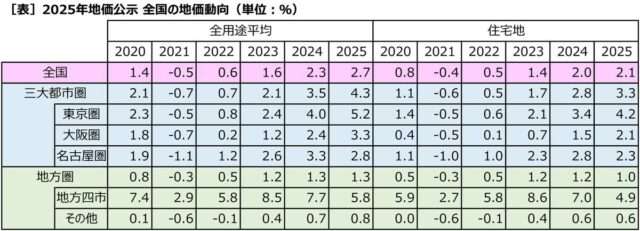 国土交通省はこのほど、2025年1月1日時点の公示地価を公表した。地域や用途による差はあるものの、景気が緩やかに回復する中で全体的には上昇基調が続き、全用途平均では2.7%の上昇に。4年連続の上昇となった。住宅地(2.1%上昇)、商業地(3.9%上昇)も4年連続で上昇し、上昇幅も拡大した。