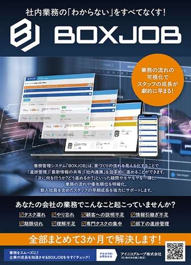 「楓工務店」ブランドで住宅事業を手がけるアイニコグループ(奈良県奈良市)は、自社のノウハウを生かした住宅・不動産業向け業務管理SaaS「BOXJOB(ボックスジョブ)」を開発し、サービスの提供を開始した。「全部まとめて3ヵ月で解決」をキャッチコピーに、多岐に渡る工程や頻繁な修正、複数部門の連携など業界特有の課題に対応する。